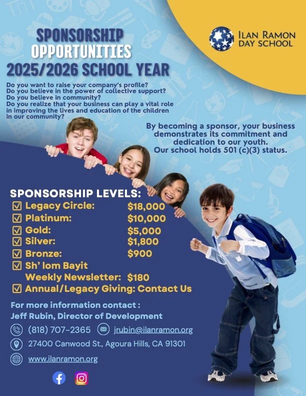 25/26 Sponsorship Information Sponsorship Descriptions and Levels25/26 School Year (Click Here) $18,000.00 Legacy Circle $10,000.00 Platinum $5,000.00 Gold $1,800.00 Silver $900.00 Bronze $180.00 Sh'lom Bayit Weekly Newsletter Custom Amount Please enter an amount $ One-Time Donation Weekly Donation Monthly Donation Quarterly Donation Annual Donation Support us by covering the fees we have to pay 3% Cover the Fee Sponsor Sponsor
